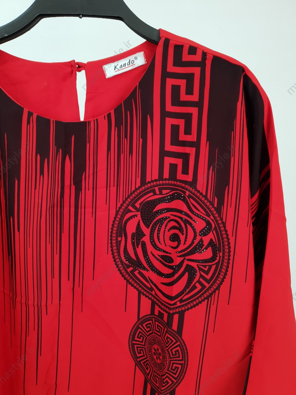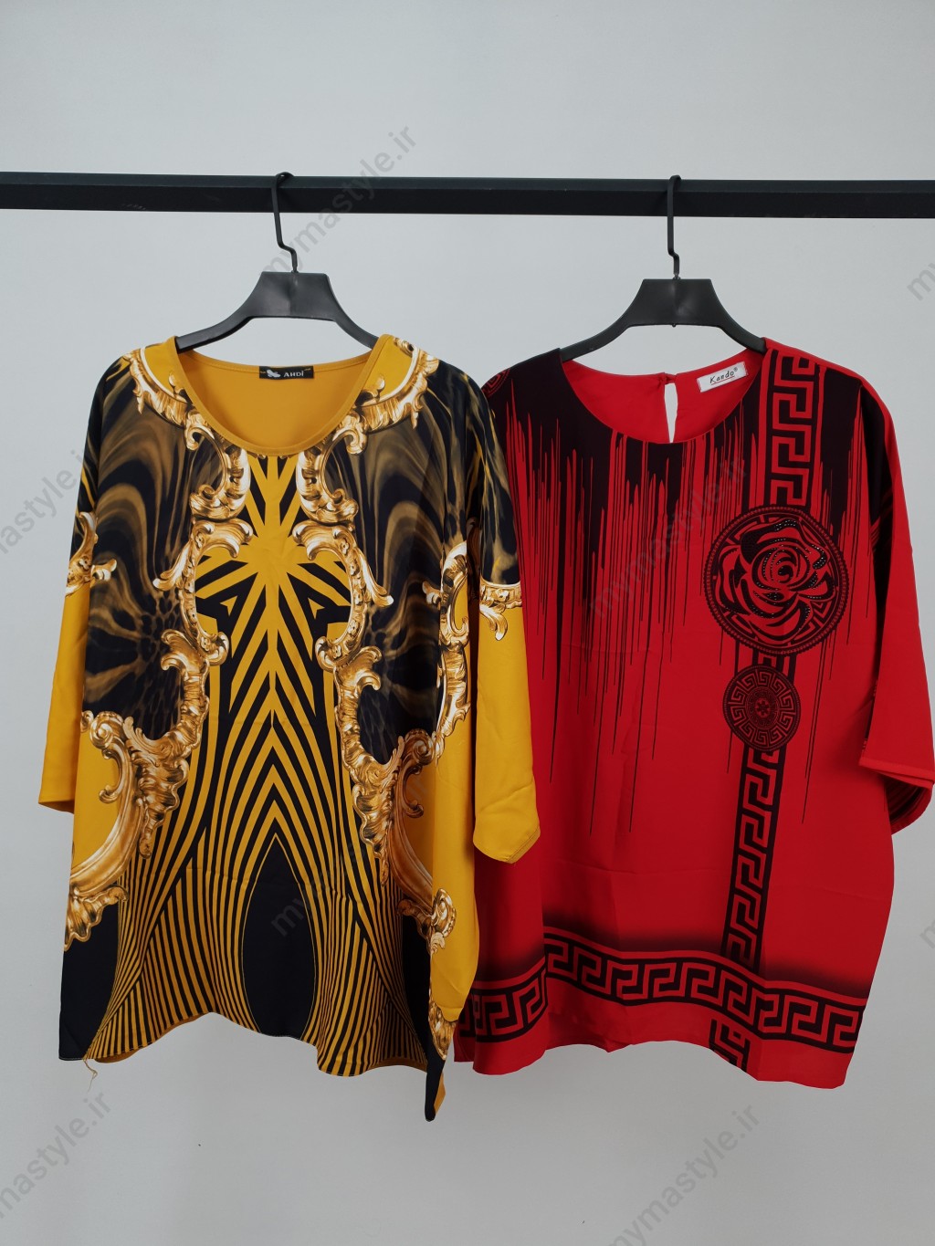 شومیز مجلسی پارچه الیزه با نگینکاری و چاپ تمیز، مدل کیمونو با یقه گرد، قد زیر باسن، فری سایز (۴۴ تا ۵۰)