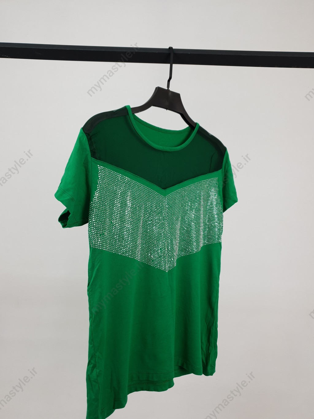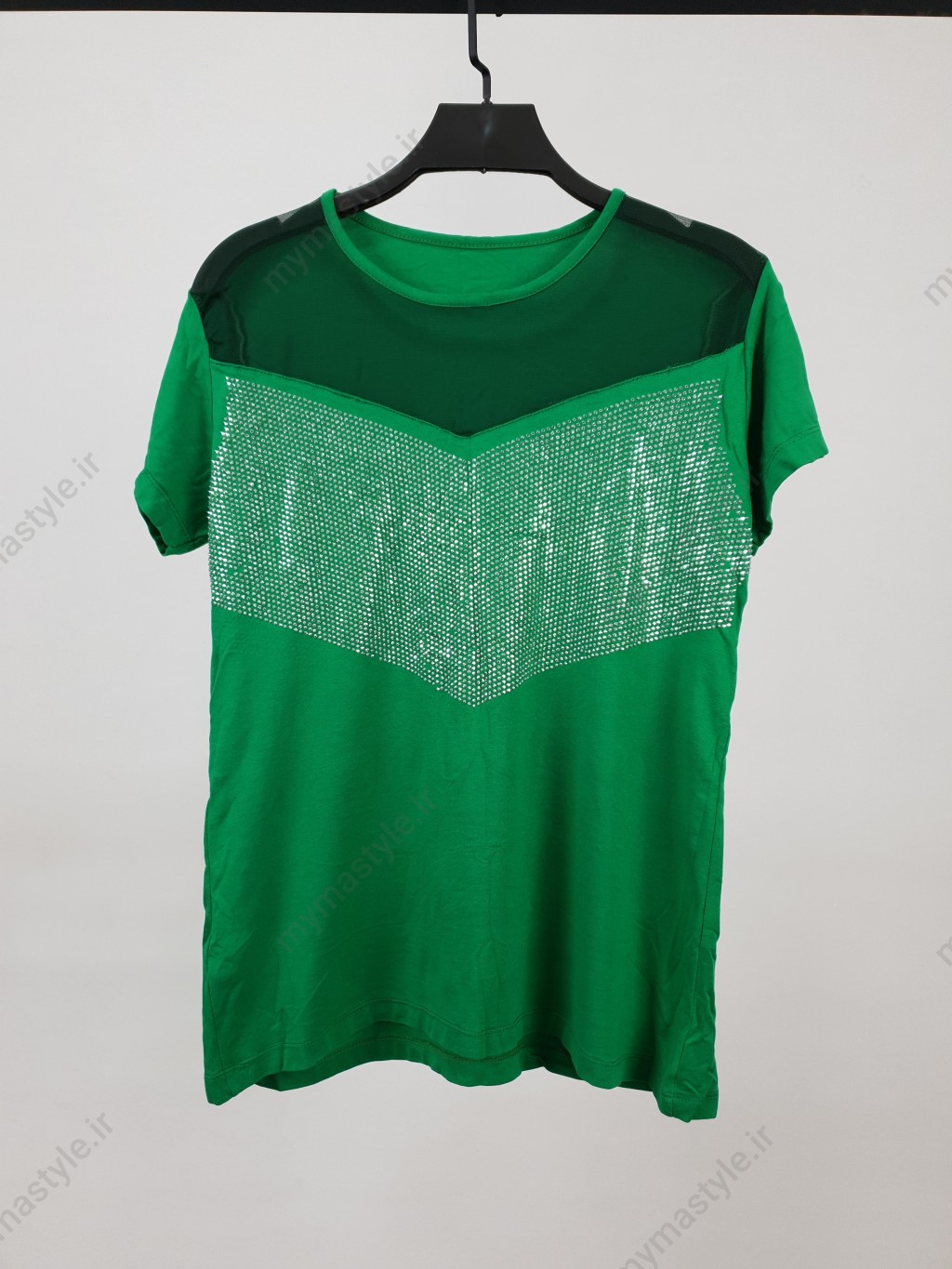 تیشرت زنانه نگینی به رنگ سبز، جنس نخ پنبه نرم و کشی، یقه تور، فری سایز.