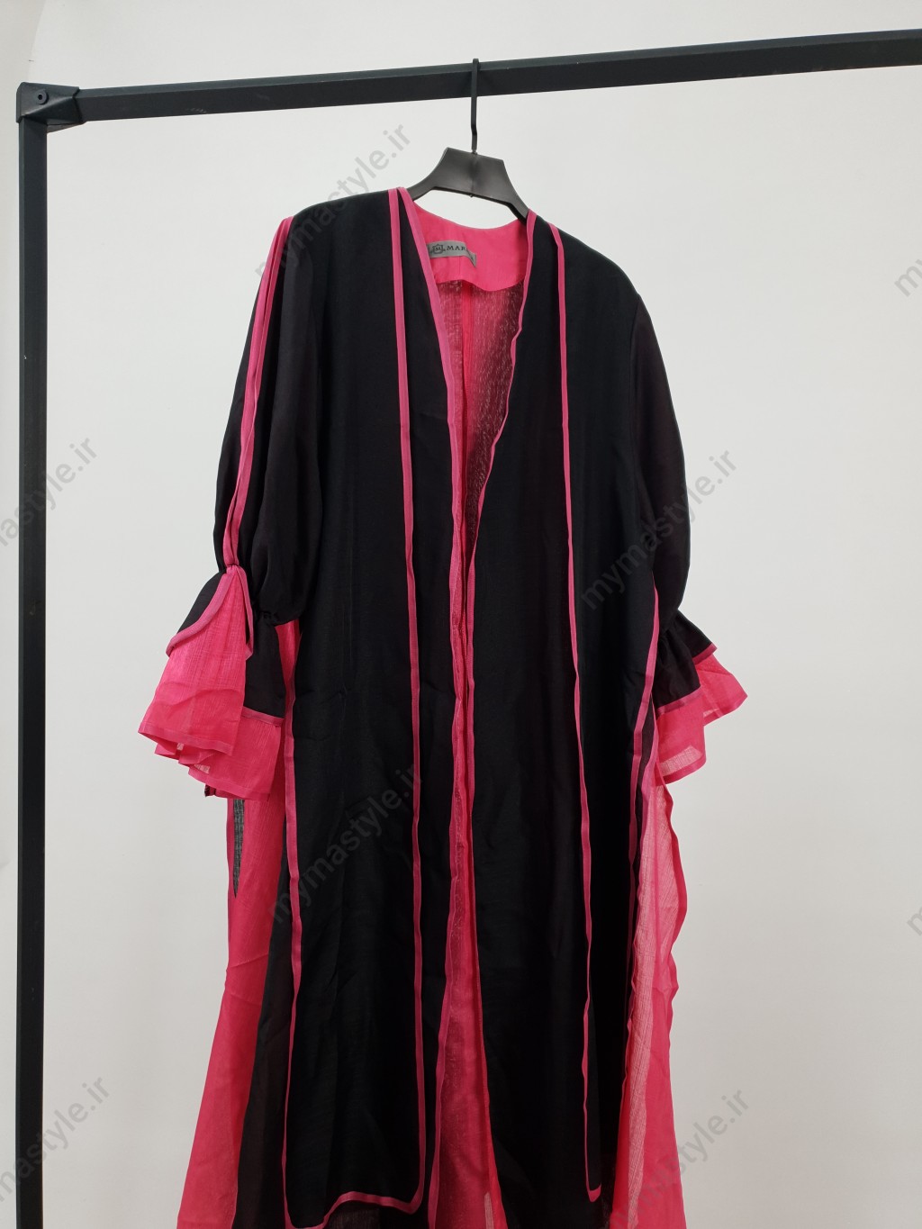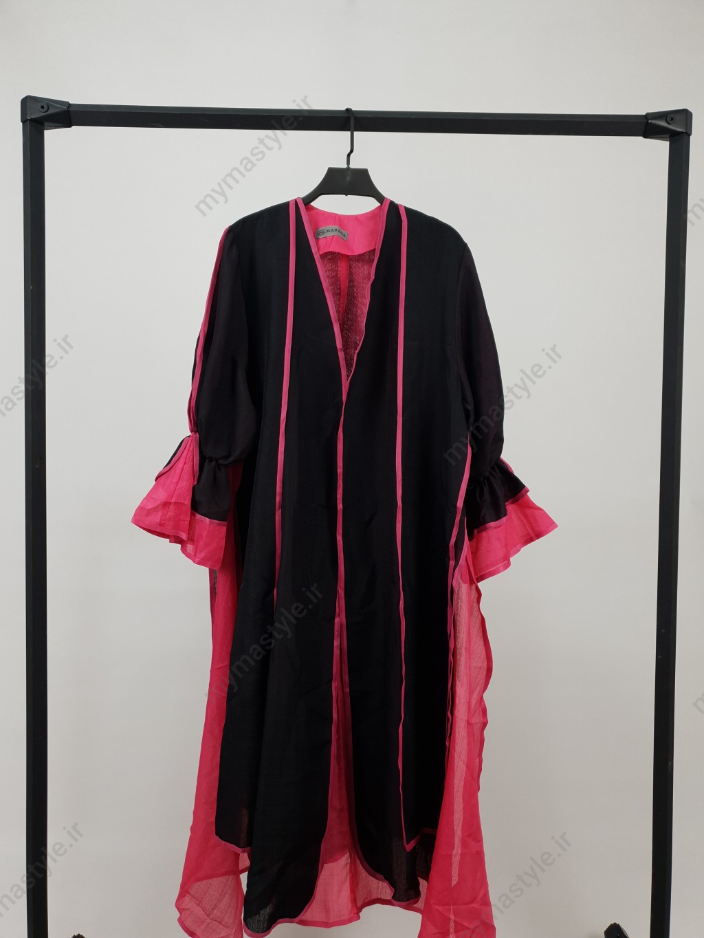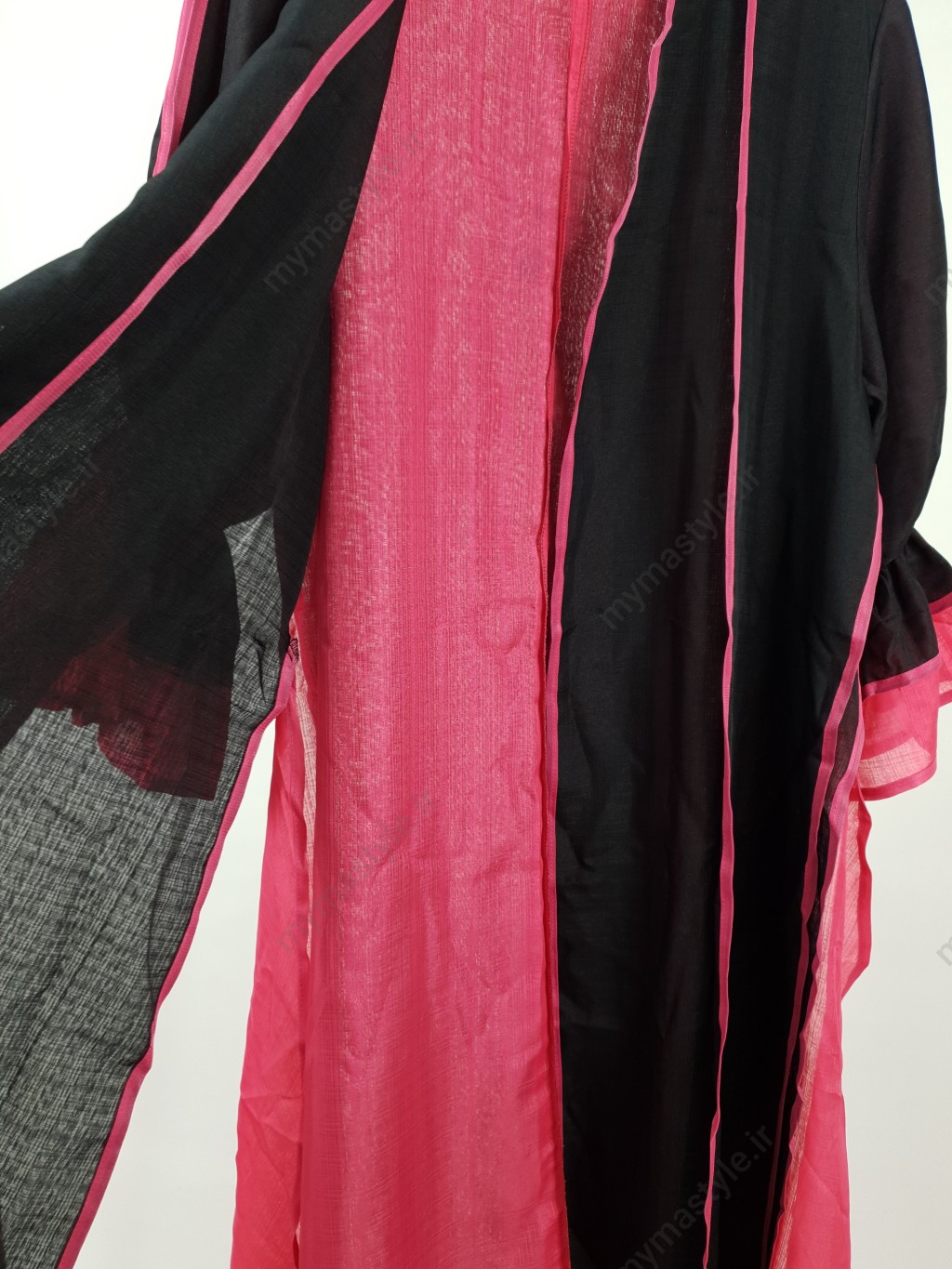 مانتو مزونی بلند جلو باز جنس نازلی، خوشپوش و سبک، فری سایز تا ۴۶، در رنگ سرخابی مشکی.